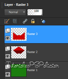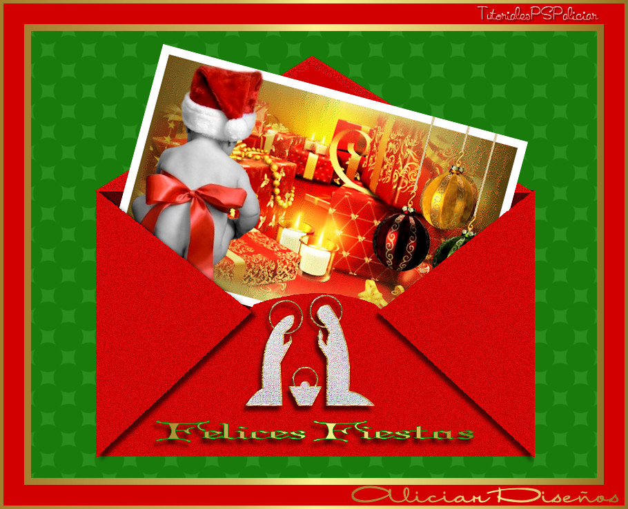 20. Escribir texto con fuente y colores a gusto. En mi caso use la fuente Christmas Card con color #1c840e en el foreground 21. Ocultar Raster 1. Fusionar las capas visibles. Volver visible Raster 1. Centrar el sobre en el paño. 22. En la capa fusionada Adjust/One Step Photo Fix. 23. Agregar borde simetrico de 10 Px. color #ffffff. Seleccionar el borde y pintar con el gradiente dorado. Anular la seleccion. 24. Agregar borde simetrico de 30 Px. color #d20000 . Anular la seleccion. 25. Agregar borde simetrico de 5 Px. color #ffffff. Seleccionar el borde y pintar con el gradiente dorado. Anular la seleccion. 26. Firmar, estampar la marca de agua tutorialespspaliciar, fusionar todo y exportar como JPG.