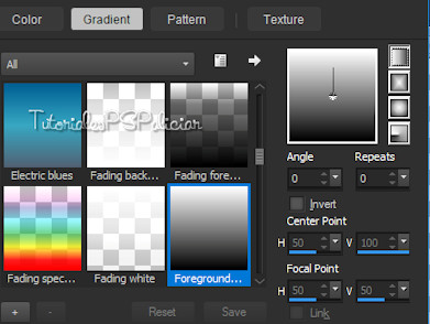 1. Abrir una nueva imagen transparente de 900 X 550 Px. 2. Pintar con el gradiente formado por el color #000000 en el primer plano y color #ffffff en el segundo.