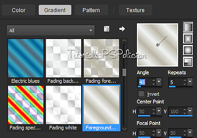 1. Abrir una nueva imagen transparente de 900 por 600 Px. 2. Pintar con el gradiente formado por los colores #bab6a6 y #f0f2f2. Configurar Estilo Linear, angulo 45, repeticiones 5.