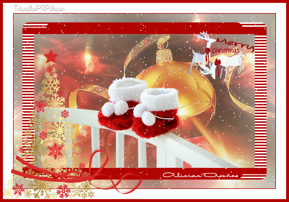 14. Agregar borde simetrico de 10 Px. color #b10400. 15. Copiar y pegar como nueva capa el Tube sapin_flocons_rouge_Conv_CibiBijoux. Redimensionar un 90%. 16. Firmar, estampar la marca de agua tutorialespspaliciar, fusionar todo y exportar como JPG.