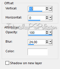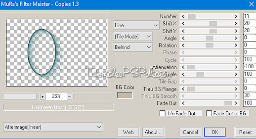 14. Copiar el tube castorke_tube_deco_1 y pegar en la seleccion. Seleccions/Select None. Centrar el tube en la elipse. 15. Raster 5. Adjust/ One Step/Photo Fix. 16. Effects/3D Effects/Drop Shadow. Repetir Paso 7 17. Activar Raster 4. Plugin Mura's Meister/Copies. 18. Activar Raster 5. Layers/Merge/Merge Down. 19. Layers/Duplicate (Raster 4). Image/Mirror/Mirror Horizontal.