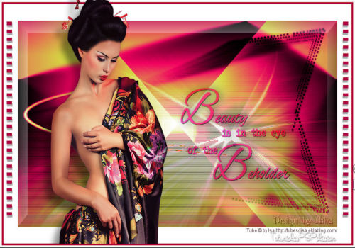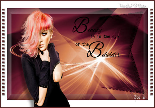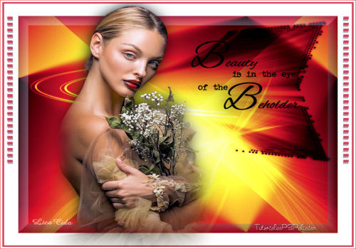 17. Duplicar la capa. Image/Mirror/Mirror Horizontal. 18. Agregar borde simetrico de 5 Px color #f53c3d. (Color 4) 19. Abrir el tube SvB (1135) Beauty. Duplicar y guardar el original. Borrar la marca de agua. 20. Effects/3D Effects/ Drop Shadow.