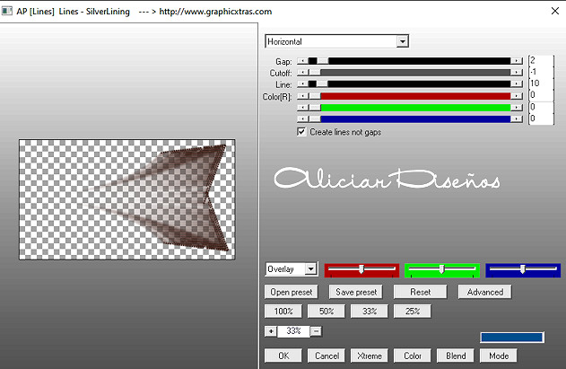 8. Plugin Eye Candy 5 Impact: Motion Trail/ Preset Beauty_aliciar . 9. Plugin AP[Lines]/Silverlining. Cambiar el modo de la capa a Burn.