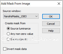 5. Cambiar el modo de la capa a Hard Light. 6. Nueva capa de trama. Pintar con color #ffffff (Color 3) Aplicar la mascara NarahsMasks_1583 desde imagen. Fusionar grupo. Cambiar el modo de la capa a Soft Light.