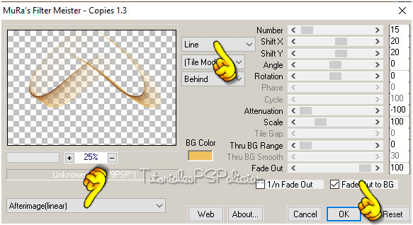 4. Cambiar el Blend Mode de la capa a Hard Light 5. Nueva capa de trama. Selections/ Load/Save Selection/Load Selection From Disk/Load Selection youarebeautiful_aliciar. 6. Plugin MuRa's Meister Copies 7. Layers/Duplicate. Effects/3D Effects/Drop Shadow.Color #f3c05f (Color 2)