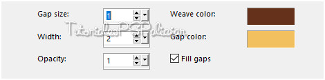 TUTORIAL 1.Abrir una nueva imagen transparente de 950 x 650 Px. 2. Abrir una nueva capa de trama. Pintar con el gradiente formado por los colores #66321c en el primer plano (Color 1) y el color 3. Effects/Texture Effects/Weave con los colores del primer y segundo plano.