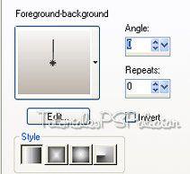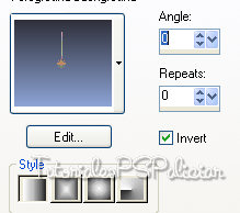4. Copiar y pegar como nueva capa el tube Tube TJ_girl_229 By Julia Caldas. Acomodar 5. Effects/3D Effects/Drop Shadow Color #000000 6. Nueva Capa. Selections/Load/Save Selection/Load Selection From Disk/sel_58aliciar Pintar la selección con el gradiente formado por los colores #2f3036 y 8da4d6. Configurar Linar, Angulo y Repeticiones 0.