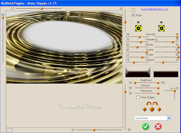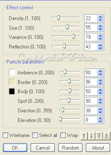 Comenzamos 1. Abrir una nueva imagen transparente de 800 por 500 Px. Pintar con el patrón cmv_gold 2. Plugin Ulead Effects/Particle (Body Color #000000) 3. Plugin Redfield/Water Ripples