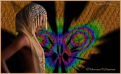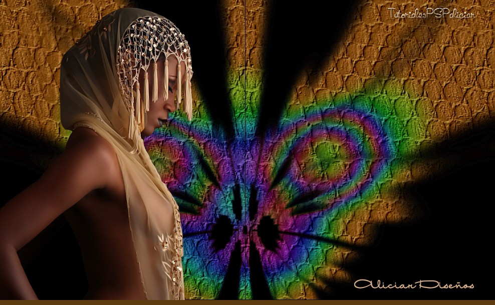 7. Copiar y pegar como nueva capa el tube calguisbeauty3119. Reflejar (Image/Mirror) y redimensionar un 85%. 8. Agregar borde inferior color #5d3d10 de 10 Px. o a gusto 9. Firmar, colocar la marca de agua tutorialespspaliciar, fusionar todo y exportar como .jpg