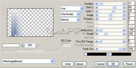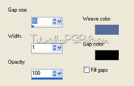 10. Bajar la Opacidad a 50% y cambiar el Blend Mode a Hard Light 11. Nueva Capa. Layers/Arrange/Send to Bottom. Pintar con el color #56719c 12. Nueva Capa. Selections/Select All. Copiar el tube 3261_overlooking_27_09_09_sdt y pegarlo en la selección. 13. Effects/Texture Effects/Weave
