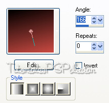4. Nueva Capa. Selections/Select All. Copiar el tube Mist corinne.vicaire - fleurs y pegar en la selección. 5. Cambiar el modo de la capa a Hard Light y bajar la opacidad a 85% 6. Nueva capa. Pintar con el gradiente formado por los colores #000000 y #ca4b43