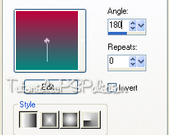 1. Abrir una nueva imagen transparente de 988 x 600 Px. 2. Pintar con el gradiente formado por los colores #bd033b y #038a7f. Configurar Estilo Linear ángulo 180, repeticiones 0