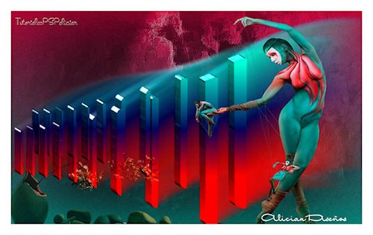 9. Cambiar el Blend Mode a Luminance. 10. Nueva capa. Selections/Load/Save Selection/Load Selection From Disk/Load sel 179aliciar 11. Pintar con el mismo gradiente pero con Invert Tildado. Quitar la selección. 12. Plugin Alien Skin Eye Candy 5 Impact Extrude