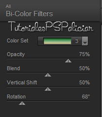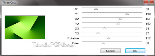 1. Abrir una nueva imagen transparente de 850 x 500 Px. Pintar con cualquier color. 2. Plugin VM Instant Art/Three Cuts (Color 90)